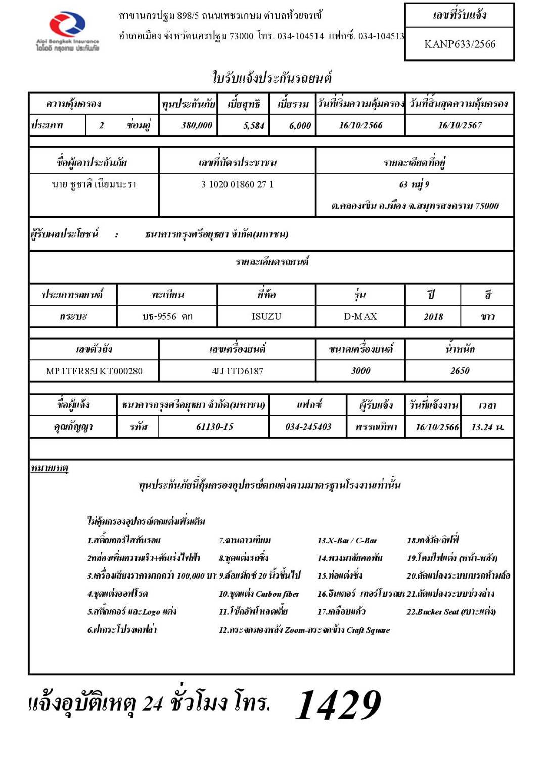 | สาขาที่รถอยู่ | เจที.คารเซ็นเตอร์ - ราขบุรี | ||
